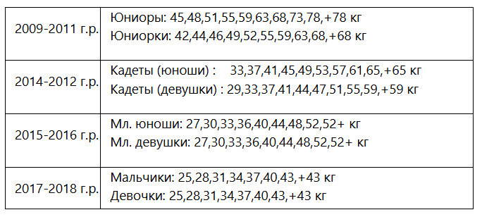 - кадеты (юноши, девушки 12-14 лет) - 2012-2014 годов рождения, категория А (без ограничений);