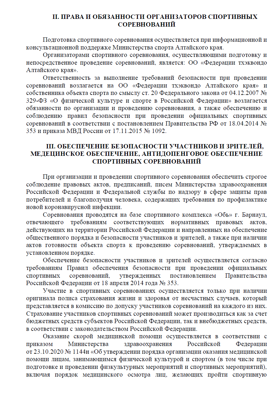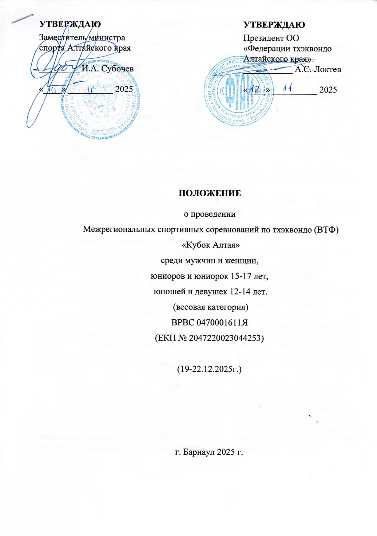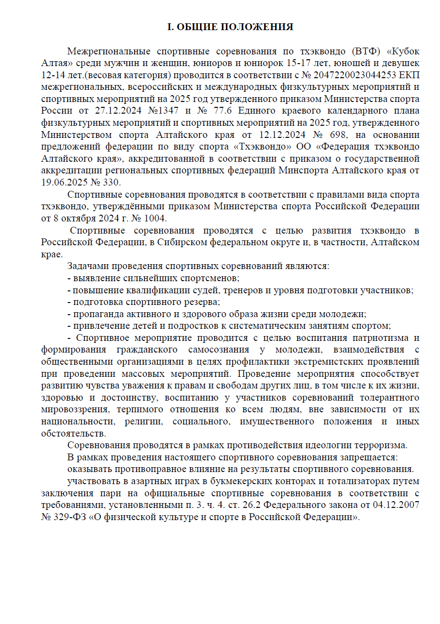 Межрегиональные спортивные соревнования по тхэквондо (ВТФ) «Кубок Алтая» среди мужчин и женщин, юниоров и юниорок 15-17 лет, юношей и девушек 12-14 лет (весовая категория) проводится в соответствии с ЕКП № 2047220023044253 утвержденного приказом Министерства спорта России от 27.12.2024 №1347.