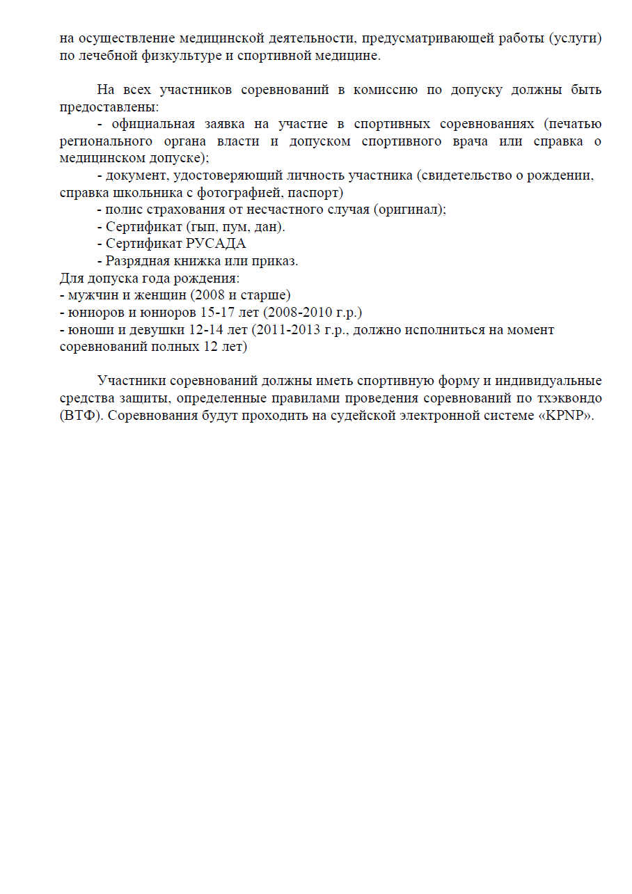 Каждый участник соревнований должен иметь спортивную форму и индивидуальные средства защиты, определенные правилами проведения соревнований по тхэквондо (ВТФ), электронные футы для системы «KPNP» K1, электронный защитный жилет «KPNP» K1, электронный защитный шлем «KPNP» K1. При необходимости, электронный защитный жилет «KPNP» K1 и электронный защитный шлем «KPNP» K1, можно будет арендовать в пункте проката (из расчета 3000 рублей на все поединки для каждого спортсмена, заявленного командой)