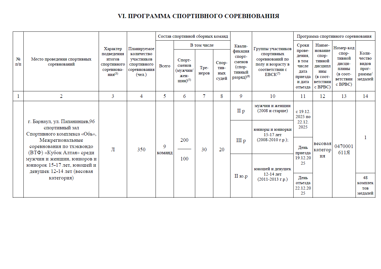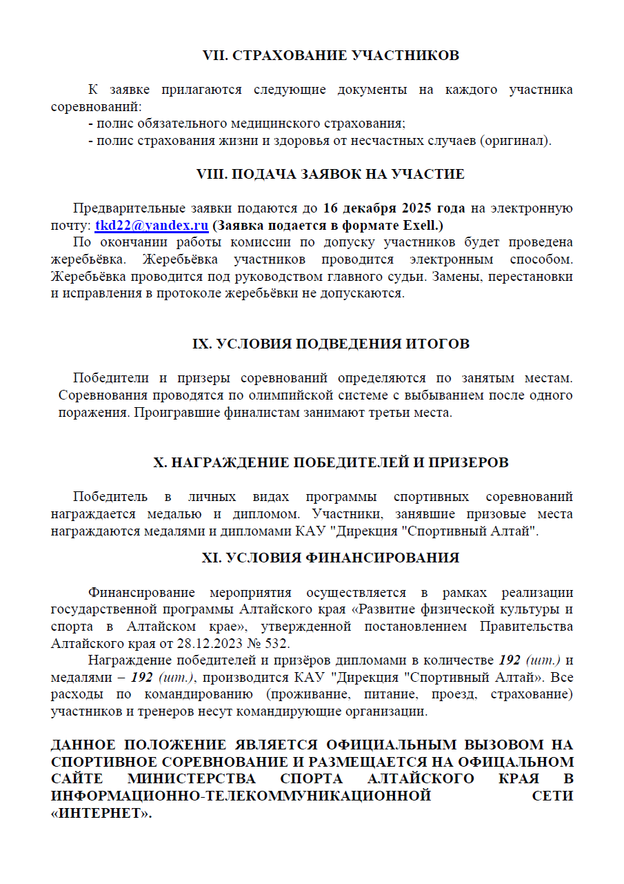 Предварительные заявки подаются до 16 декабря 2025 года на электронную почту: tkd22@yandex.ru (Заявка подается в формате Eхеll.)