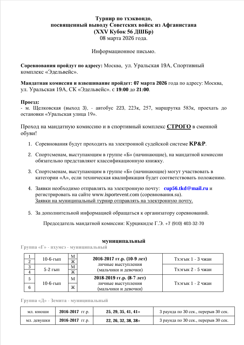 Положение о проведении Турнира по тхэквондо, посвященного выводу Советских войск из Афганистана (ХХV Кубок 56 ДШБр) - СКАЧАТЬ