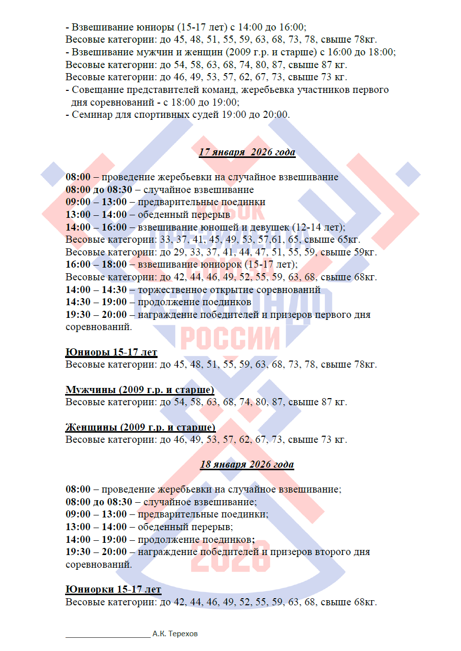 14:00-14:30 Жеребьевка контрольного взвешивания