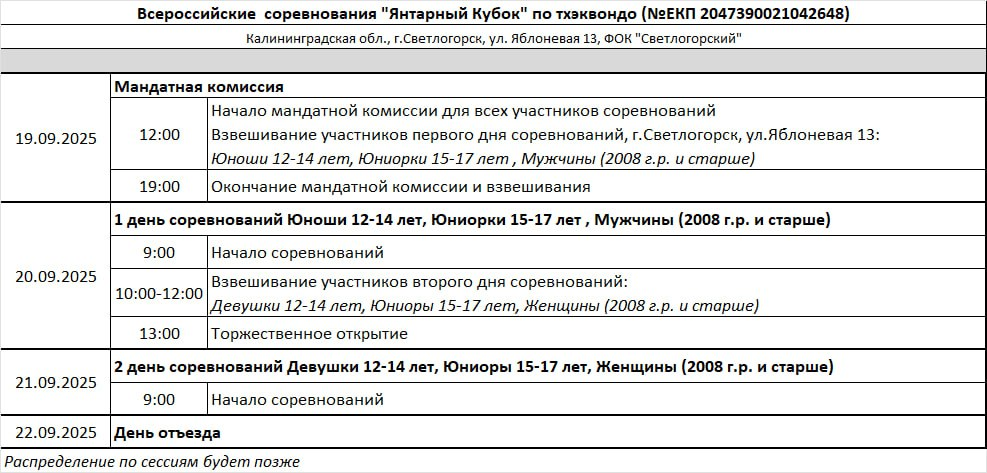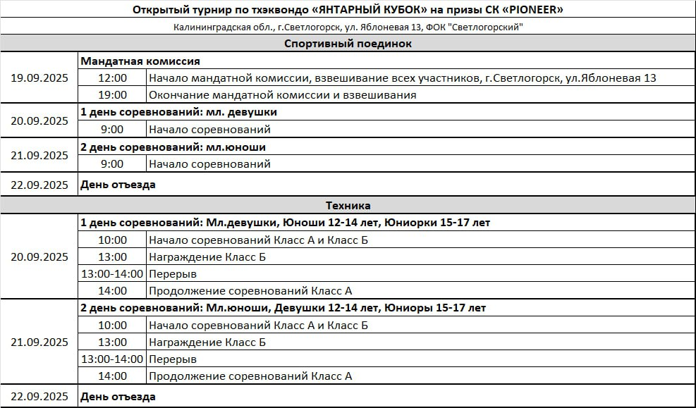 Даты проведения: 19.09 –мандатная комиссия, 20-21.09 –поединки, 22.09 день отъезда.
