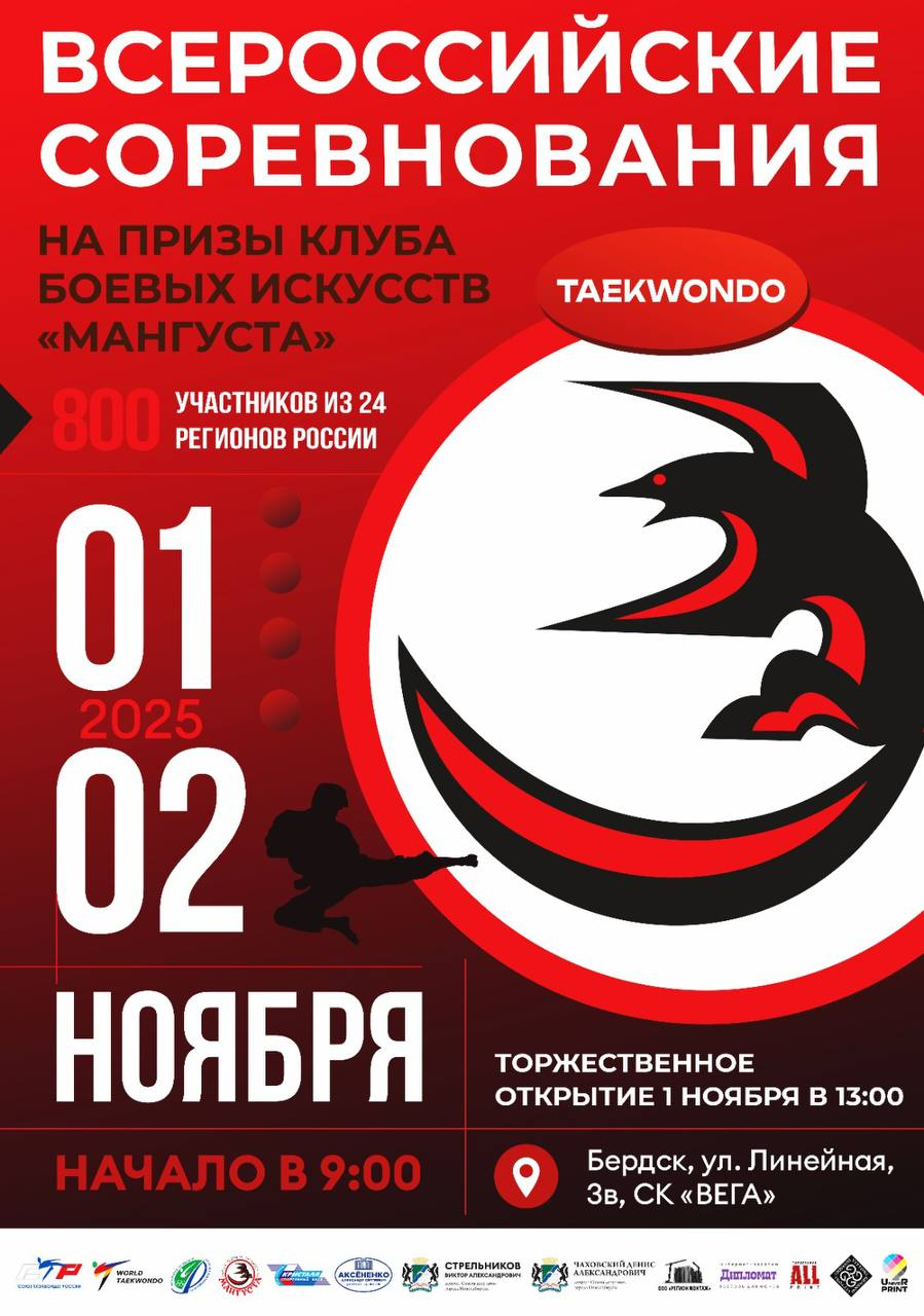 С 31 октября по 3 ноября 2025г. г. Бердск, Новосибирская область будут проходить всероссийские спортивные соревнования по тхэквондо ВТФ «Кубок Мангуста». Соревнования пройдут в спортивном комплексе в СК «ВЕГА», по адресу г. Бердск, ул., Линейная, 3в.