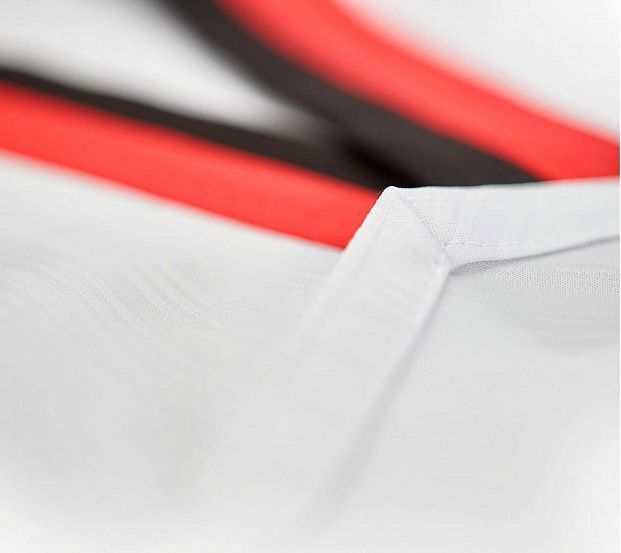 Добок тхэквондо Адидас сшит из материала с трехмерной структурой, обеспечивающей хорошую микровентиляцию, он впитывает пот и выводит его на поверхность ткани для дальнейшего быстрого испарения.
