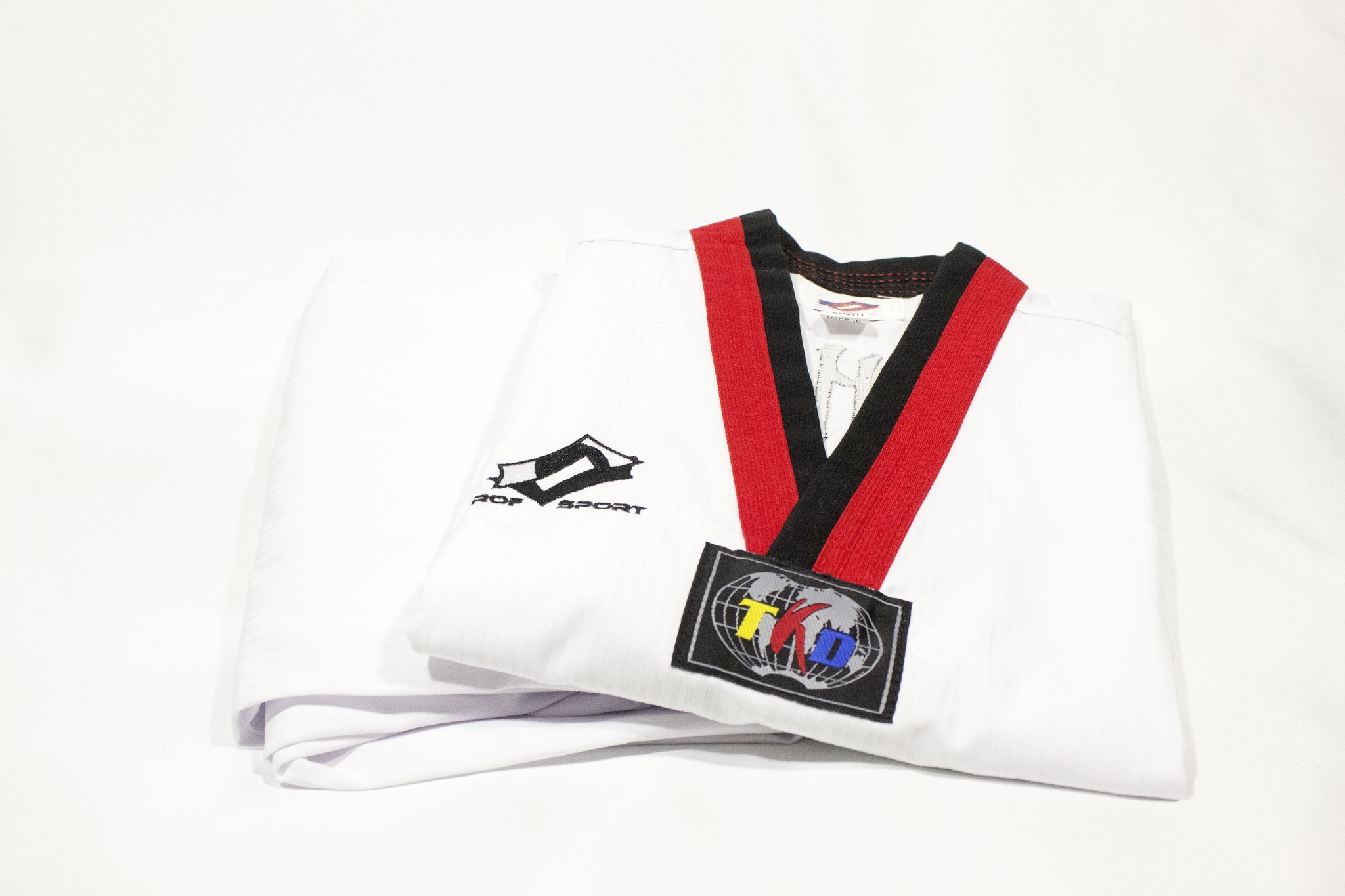 Добок WT ProfSport Style TKD Poom с вышивкой на спине. Красно-черный ворот. Практичный и удобный, выполненый из смешанной (65% - полиэстер, 35% - хлопок) отбеленной рифленной ткани.