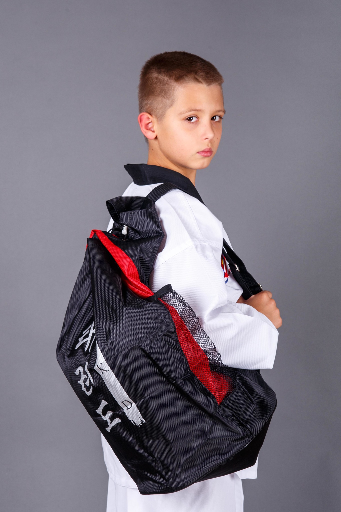 - Надпись на рюкзаке ТAE KWON DO на корейском и символичный черный пояс.